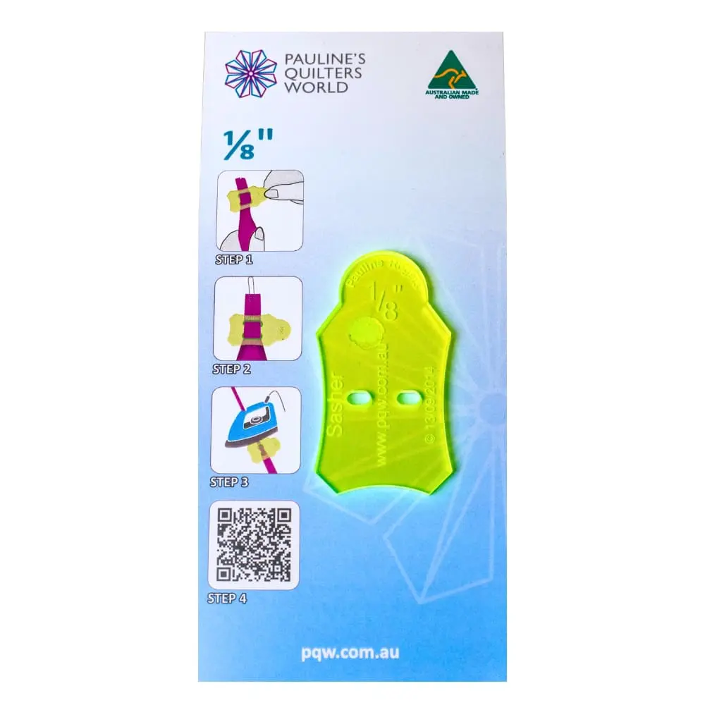 Please note – the size on the Sasher is the finished size of the folded strip. If you require a 1/8″ finished size, cut the fabric 1/4″ wide and then put it through the 1/8″ Sasher.