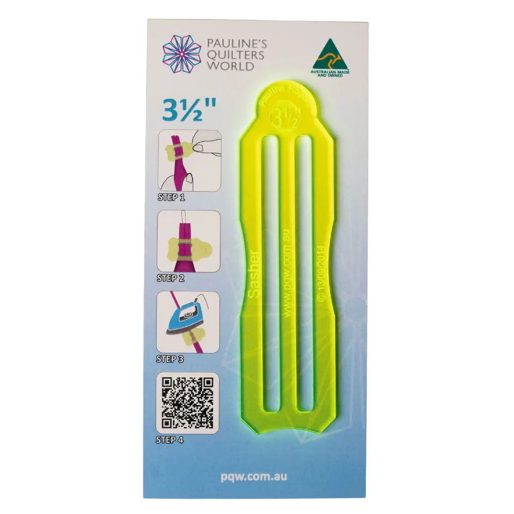 The 3 1/2″ Sasher is a great size for making 1 3/4″ wide bag handles. Simply put a 7″ strip through the 3 1/2″ Sasher, then through the 1 3/4″ Sasher for bag handles with no turning through (add your wadding/ batting after folding)!