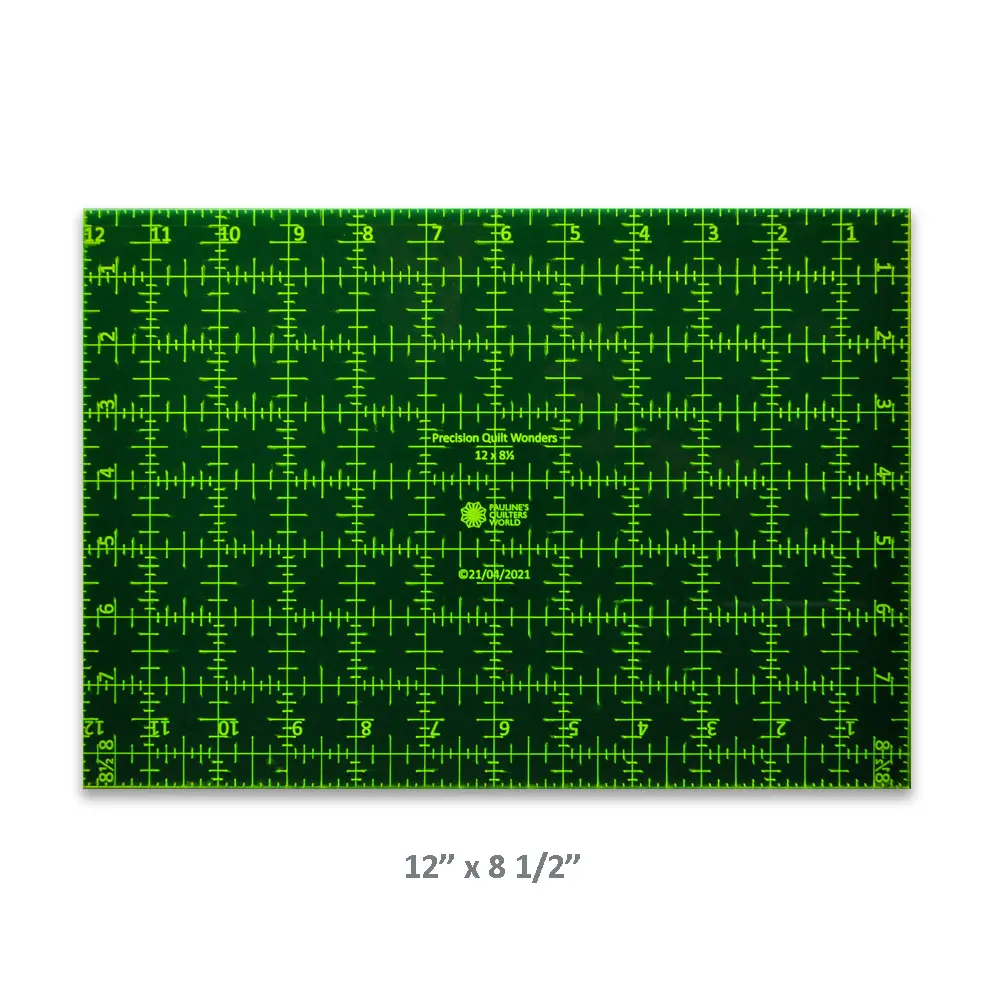 The Precision Quilt Wonders Ruler 12″ x 8 1/2″ is used for measuring and cutting in quilt and patchwork projects.